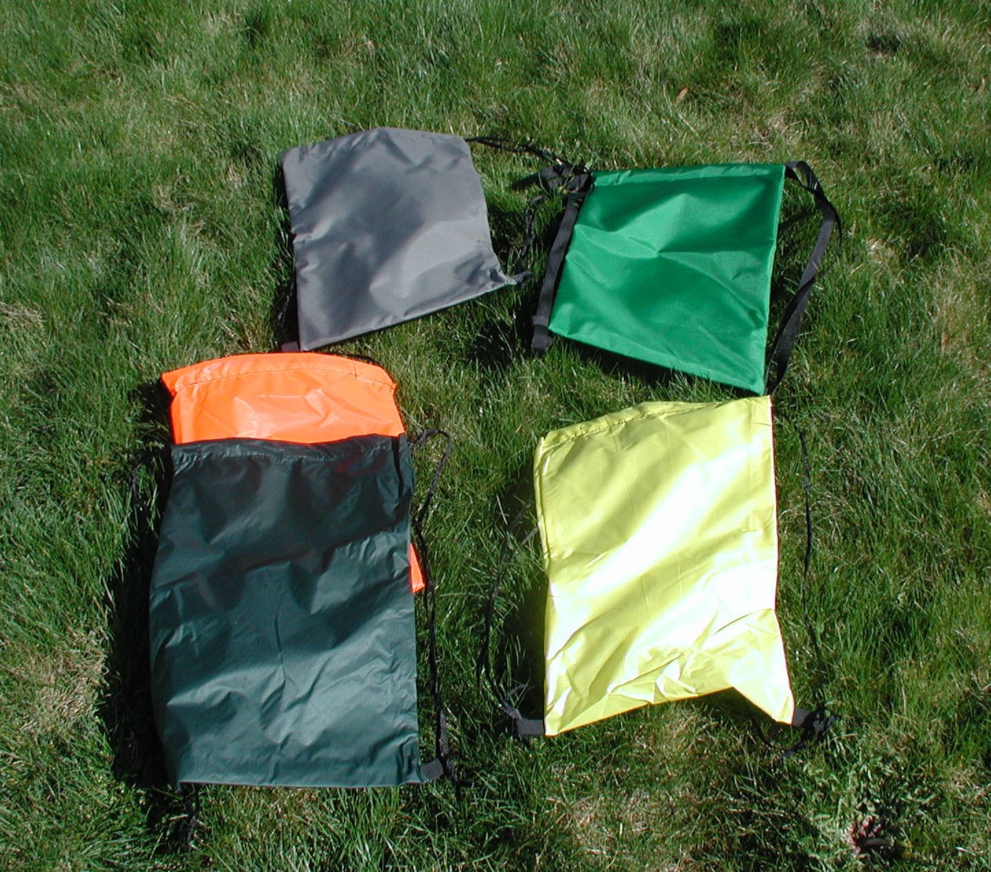 Clockwise from top left. 210d Foliage Green, 420d grass green, 70d silnylon yellow, 30d silnylon dark forest, 30d silnylon blaze orange.