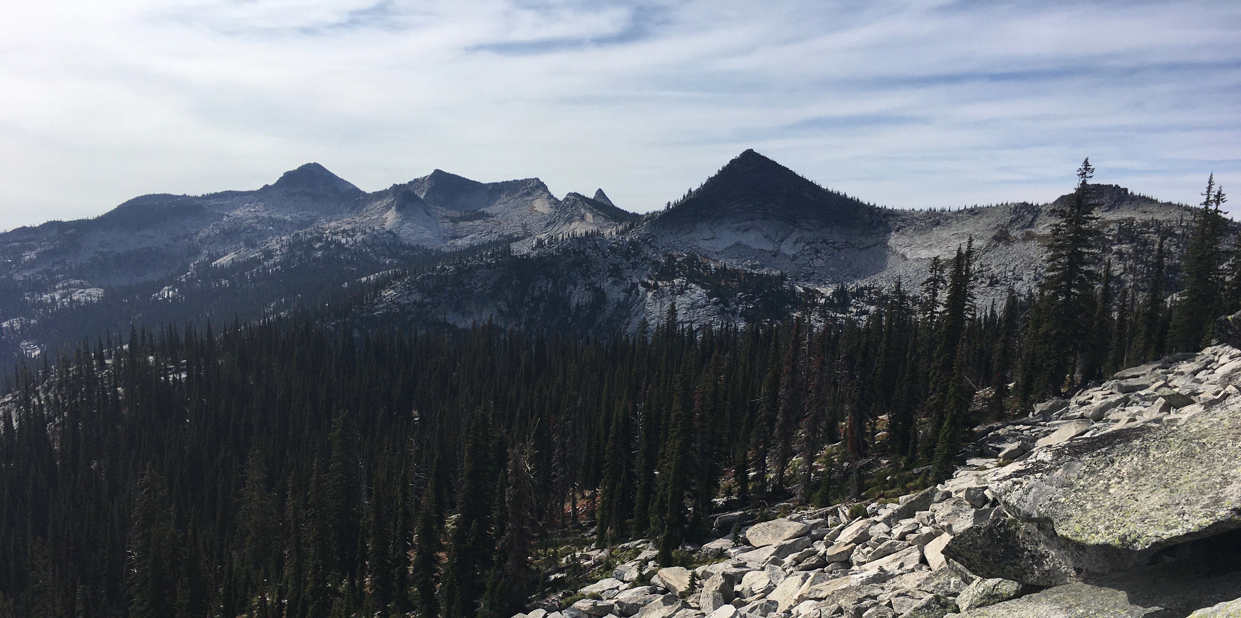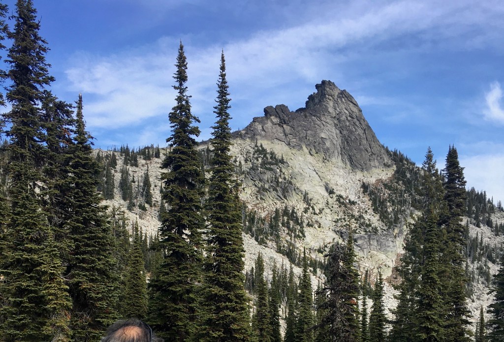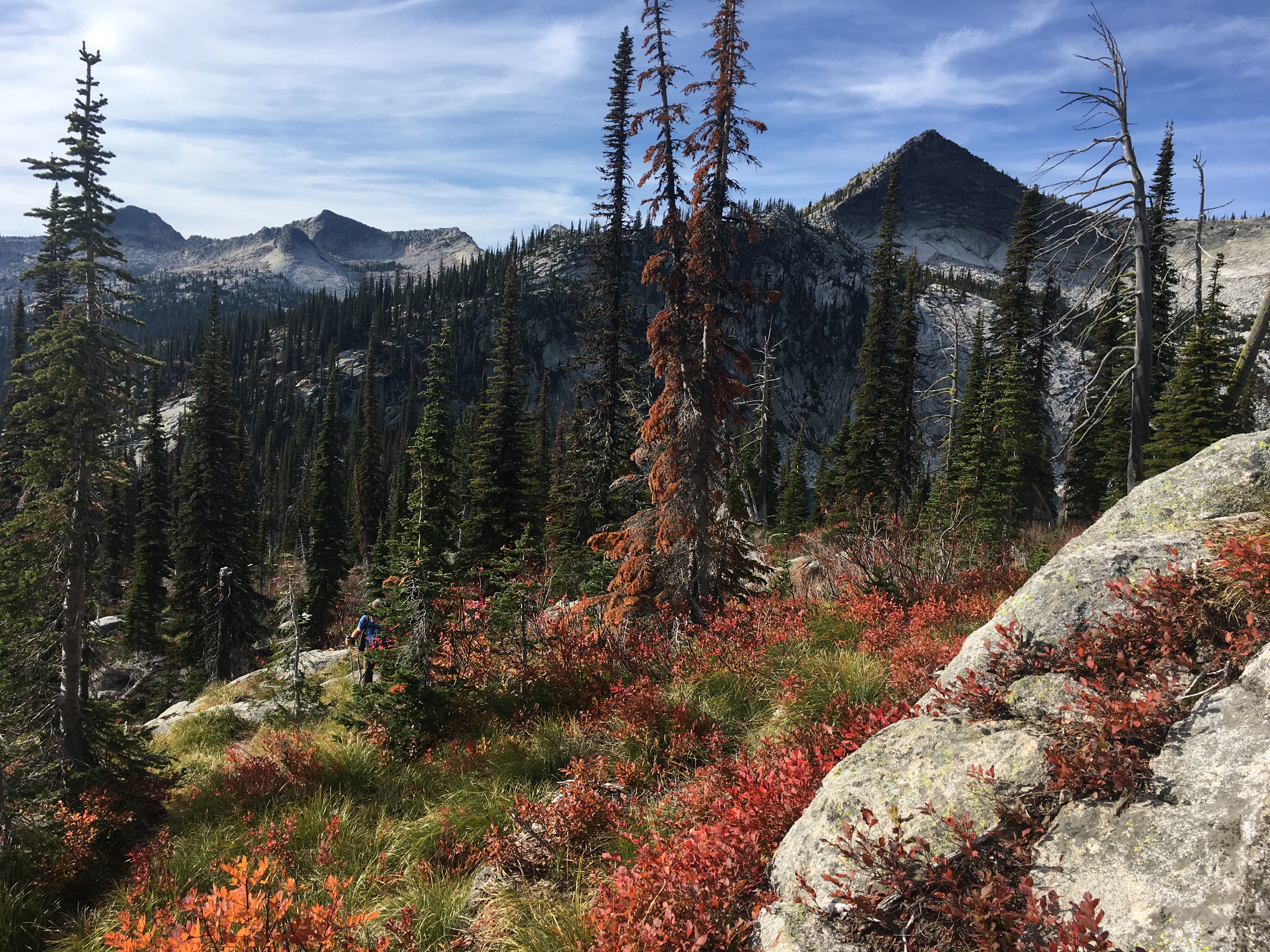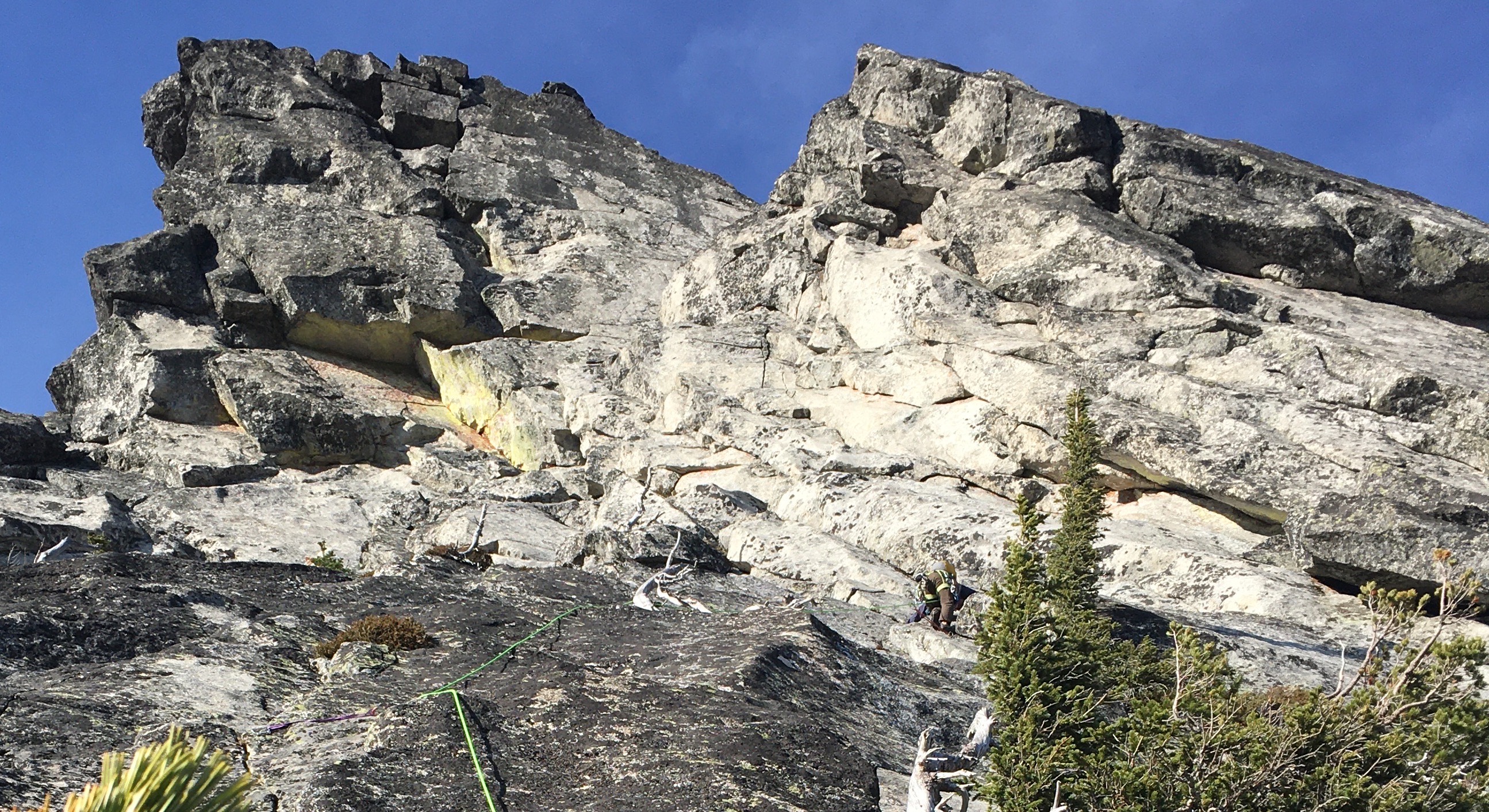 Route goes up center of face at juncture of white and grey rock.Fall colors along the Selkirk CrestLots of boulders and small cliffs on approach. It took hours coming down after dark. Bring bright headlamps and maybe wands if climbing in the dark shoulder seasons.Final two pitches. Too far left, we had to aid an overhang to get back on route. Guidebook calls this climb 5.7+ Grade II. Our route was more like 5.8+ A1 Grade III due to route finding challenges.