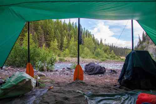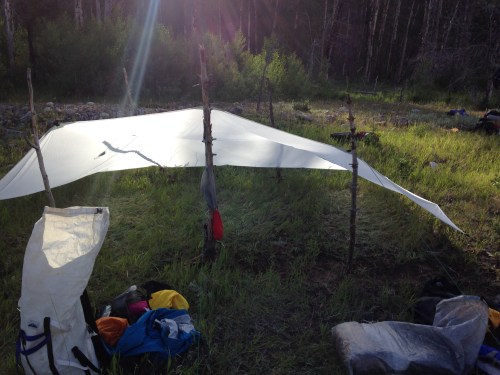 Adjust cord length using the tautline hitches and by moving stakes so that the tarp is stretched snug with minimum wrinkles. In a wind, you want the tarp to hum, not flap.