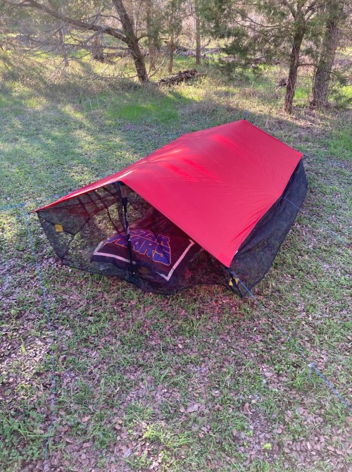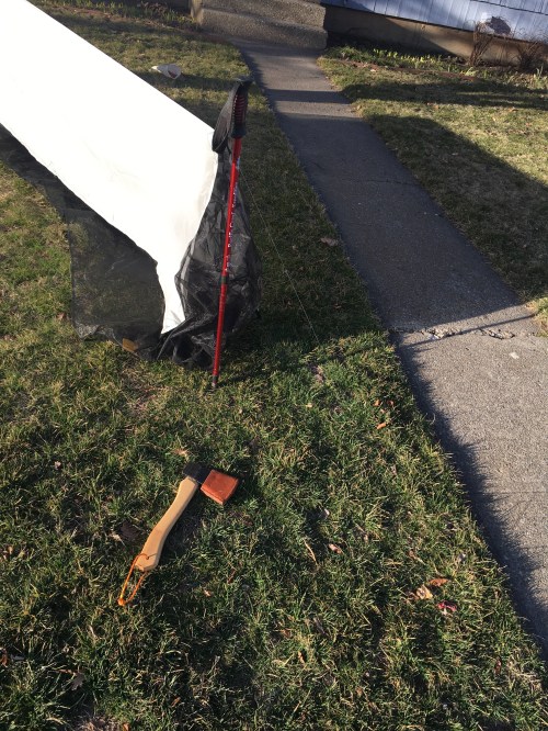 - 2 trees, trekking poles, or tarp poles (use of at least one tree is easier to set up for one person, if using poles two people holding poles on each end really speeds things up)