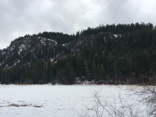 Wet and snowy. Plastic boots work great. Lots of animal tracks. Cliff above the lake looks interesting, rock climbing in a warmer season?